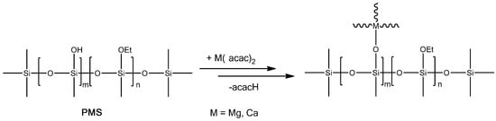 Sketch of the synthesis of the single-source precursor for SiCaMgOC upon chemical modification of PMS with acetyl acetonates of Ca and Mg.