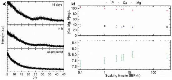 (a) XRD patterns of as-prepared SiOC powders (bottom) as well as after soaking in SBF [28] at 37 °C for 14 h (middle) and 15 days (top); (b) evolution of the content of Ca, Mg, and P in SBF (above) and pH (below) as a function of the soaking time during the SBF exposure of SiOC powders.