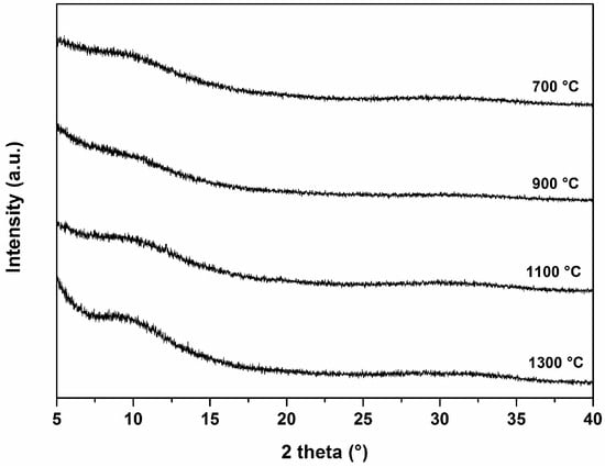 Diffraction patterns of SiCaMgOC glass pyrolyzed at 700, 900, 1100, and 1300 °C.