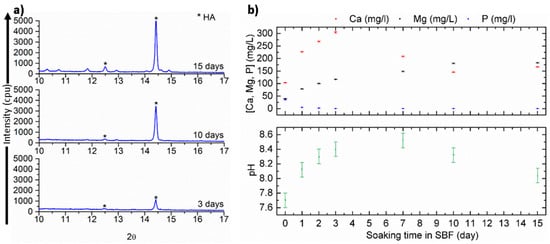 (a) XRD patterns of SiCaMgOC-1100 after soaking in SBF for 3, 10, and 15 days; (b) evolution of the Ca, Mg, and P contents in SBF (above) and pH (below) as a function of soaking time during the exposure of SiCaMgOC-1100 powder samples at 37 °C.