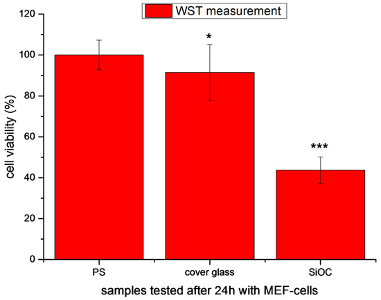 Cell viability measurement of MEF cells on polystyrene (PS), cover glass (CG), and SiOC samples after 24 h incubation. The significance level was set as * p < 0.05, ** p < 0.01, and *** p < 0.001. For the comparison of the mean values, the Tukey test was used.
