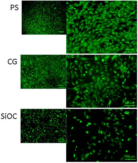 Figure 6 shows FM images of MEF cells in direct contact with the different samples after 24 h of incubation, whereby the green color corresponds to the staining of the cell cytosol of the living cells. In correlation to the viability measurements (Figure 5), there is a strong reduction in the cell layer, and the typical fibroblastic morphology is not expressed on SiOC samples. Although the attached cells on the surface, i.e., the living cells, are visualized in green color, there is no pronounced cell spreading on the SiOC surfaces.
