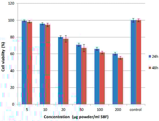 The cytotoxicity of the SiOC powder samples was tested via an MTT assay [17] in the presence of HEK 293 cells (derived from human embryonic kidney). MTT (i.e., 3-[4,5-dimethylthiazol-2-yl]-2,5-diphenyltetrazolium bromide), which is yellow in color, is absorbed by the mitochondria and enzymatically converted by succinic dehydrogenase into formazan (purple color). Thus, HEK 293 cells were initially seeded (150 μg cells/mL) and treated with the SiOC powder particles (solid loadings of 50–20 μg/mL) and incubated for 24 and 48 h at 37 °C, in an atmosphere supplemented with 5% CO2. Subsequently, MTT was added (5 mg/mL) and the solutions were further incubated for 1 h at 37 °C, 5% CO2, in order to convert the yellow MTT by the viable cells into purple formazan crystals. The results from the MTT assay are expressed as the means of the absorptions at 630 nm; thus, the measured absorbance is correlated with the number of viable cells, and the cell viability (in %) at different soaking times and solid loadings can be indicated.