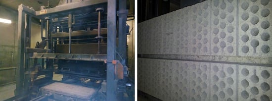 To manufacture the bricks and hollow blocks, the fresh mixture was poured into the corresponding mold and pressed by an automatic compacting unit (model PB-1200, Balbinot, Bellegarde-Sur-Valserine, France) at 69 KPa for 5 s. The mixture was vibrated simultaneously until the elements were removed from the mold. Then, the elements were brought to the curing chamber by means of a tray conveyor (see Figure 2 and Figure 3).