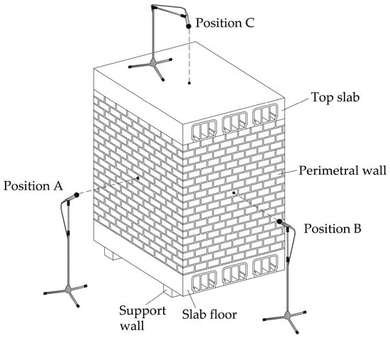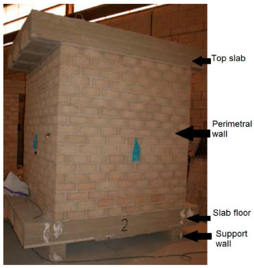 The three cells had equal external dimensions (2.00 m × 2.00 m × 2.60 m). Each one was made of two short support walls, a unidirectional slab floor, four perimeter walls at 90°, and a top slab. As shown in Figure 5, the support walls sat over the shop floor, the slab floor rested over the support walls, the perimeter walls were raised over the slab floor, and finally, the top slab was laid on top of the perimeter walls. An entrance in the shape of a rectangle was initially opened in one of the walls to allow for the introduction of the measuring equipment. The entrance was then closed for measurement with the same building elements. Results were collected by a computer outside of the closed cells.