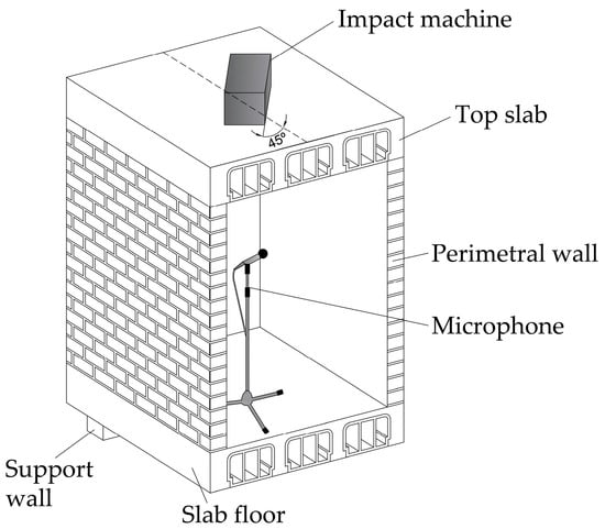 The impact machine was located over the middle point of the top slab, at 45° to the main direction of the lattice joists. The transmitted impact sound was read using a microphone located in the geometrical centre of the inner volume of the cell (Figure 8).