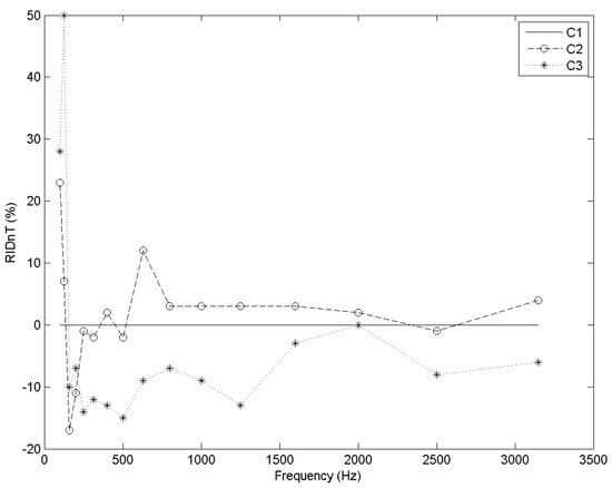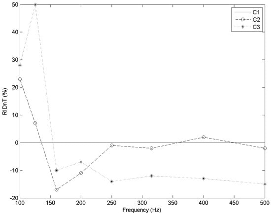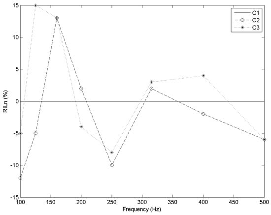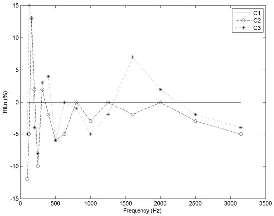 From approximately 190 to 290 Hz, both cells had a worse response than the standard—up to 10% (Figure 11). From 290 Hz and on, C2 is essentially less insulant than C1. However, from approximately 1300 to 2250 Hz, the performance of C3 was up to 7% better (Figure 12).
