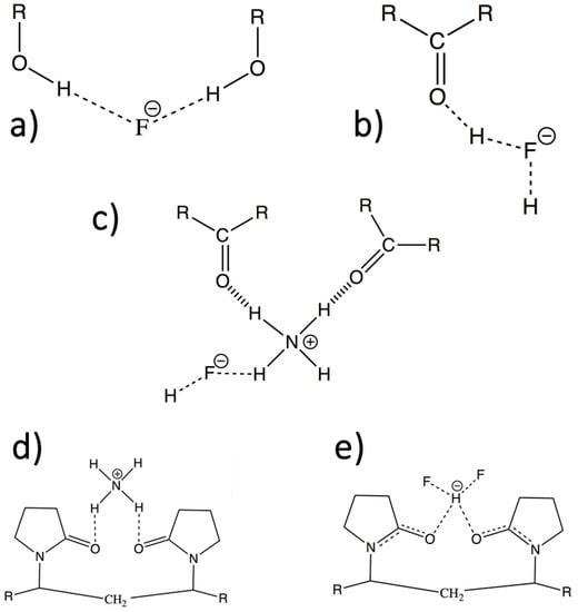 A selection of possible coordination geometries of fluoride ions and ammonium ions to different functional groups: (a) Coordination of F− to alcohol groups; (b) Coordination of F2H− to any kind of C=O; (c) Coordination of the ammonium ion to an aldehyde or acetate type of functional group and further coordination to F2H−; and (d,e) Example of coordination to polyvinyl pyrrolidone (PVP) with the ammonium group or with the F2H− ion.