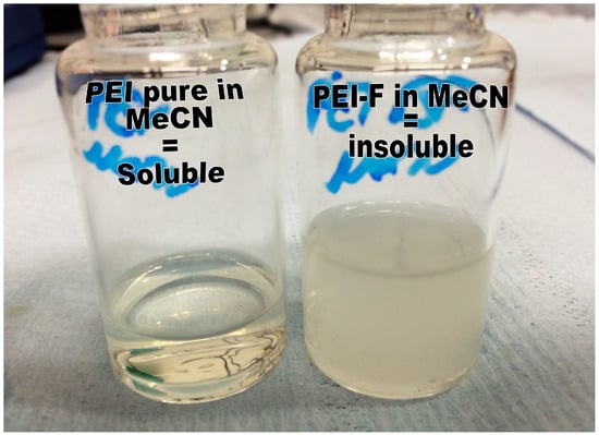Both of the amine-containing compounds, PEI and TEPA, formed, in aqueous solution, a protonated polycation [26], and as side-reactions might occur, the values reported might not represent the actual fluoride concentration. Fluoride containing PEI polymer (PEI-F) also showed an unexpected behavior, whereby PEI was completely soluble in MeCN, while the product PEI-F showed almost no dissolution (Figure 2).