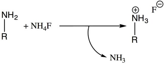19F NMR spectroscopic measurements showed the typical fluoride doublet resonance at around −150 ppm for PVAC-F, PVP-F and Xylitol-F [27,28,29]. Malto-F in CD3CN also showed a similar resonance at −107 ppm, which is presumably attributable to F− ions [30]. PEI and TEPA also showed the presence of F− ions. We assume that a partial substitution of the secondary R–NH2 groups to form R–NH3+•F− had taken place, which could explain the presence of F−, and not F2H− as expected (Figure 3, see also Experimental Section for details of NH3 evolution).