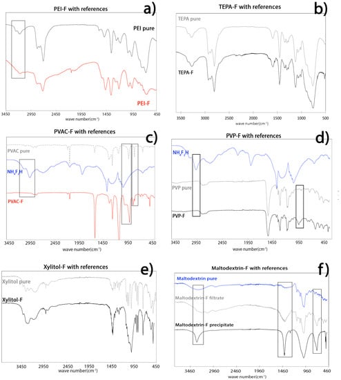IR spectra of: TEPA-F (a); PEI-F (b); PVAC-F (c); PVP-F (d); Xy-F (e); and Malto-F (f).