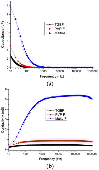 Frequency dependent conductivity spectra and frequency dependent capacitance spectra of compounds TGBF, PVP-F and Malto-F. (a) Capacitance; (b) Conductivity.