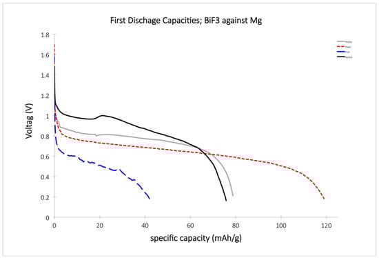 PVAC showed an OCV of about 1.7 V, which is 1 V below the theoretical OCV of 2.7 V for the system BiF3 against Mg, and a discharge plateau at about 0.7 V. The discharge curve was smooth and showed a total gravimetric capacity of about 120 mAh/g (Figure 7).