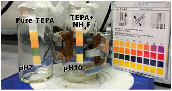 The gas evolution of these reactions was monitored in two ways. Initially, tests using pH-paper showed that the simple stirring of NH4F in the presence of TEPA or PEI released a basic gas (Figure 9). A further test was also carried out, whereby the gas released was passed by gas-outlet into an aqueous solution of CuCl2. During the reaction the color of this solution changed from colorless to deep blue due to the formation of [Cu(NH3)4]Cl2 upon the evolution of NH3. (See Supplementary Materials Figure S6). For the other reactions, NH3 gas evolution could be observed, but only over longer reaction times with heating.