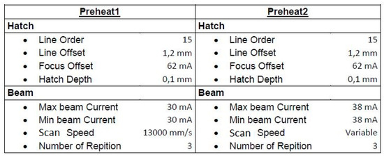 The SEBM system A1 of the company Arcam AB, Mölndal, Sweden, was used with the metal powder Ti6Al4V. The spherical powder has a particle size distribution of 45–105 µm and was acquired from the company Arcam AB. The samples were built with a layer thickness of 50 µm. The sintering parameters were customized in order to achieve an increased sinter quality. A test series was carried out in which different scan speeds for Preheat2 were used for sintering only the area of the components. The parameters for Preheat1 were left unchanged since this is a critical process for the sintering of the loose powder to create an initial stability. In this regard, Preheat2 continues on pre-sintered powder and has therefore a larger process window. For this study, Preheat2 was modified by the variation of the scan speed. The test series was carried out in order to investigate the increase in the sintering quality of the powder. The starting scan speed was the established scan speed of 14.6 m/s from the standard Preheat2 strategy of the preheat theme. Going from there, a decrease in scan speed by 1 m/s was implemented until a scan speed of 8.6 m/s was reached. The following general preheat parameters (see Figure 1) were used for the test series.