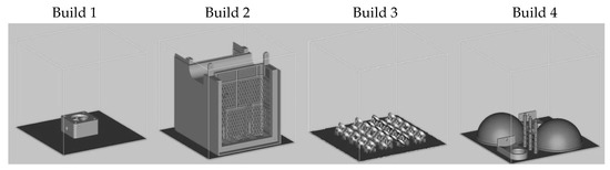A variety of build jobs were carried out. Figure 2 shows the four build jobs that were used for the investigation of the build time. The criteria for these build jobs were build size, build volume, and the amount of parts needed in order to cover a large variety of different build jobs. For the four build jobs, Build 1 was categorized as one medium-sized component, Build 2 as one big component, Build 3 as many small components, and Build 4 as a mixture of small and large thin-walled components with a relatively low build volume. The build volume for the respective build jobs are as follows: Build 1 = 104.92 cm3, Build 2 = 693.12 cm3, Build 3 = 9.764 cm3, and Build 4 = 86.65 cm3.