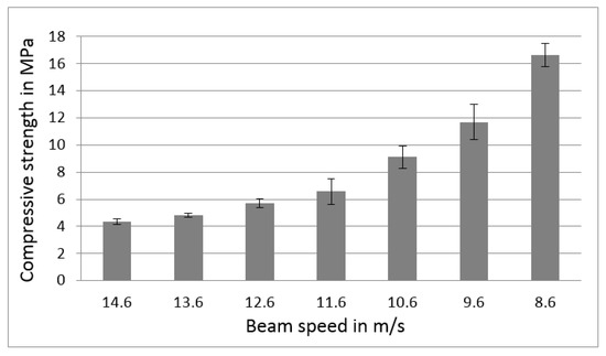 For the experimental investigation, the EBM system A1 was prepared by positioning a stainless steel start plate, pulling a vacuum of at least 5 × 10−4 mbar for the chamber room, and adjusting the electron beam for highest accuracy. The corresponding themes for the processes (preheat theme and melt theme) were loaded with a layer thickness of 50 µm. The preheat theme was modified for the study, which consists of Preheat1 and Preheat2. The scan speeds used to manufacture the test cylinders were in a range from 14.6 m/s down to 8.6 m/s with an interval of 1 m/s. At 8.6 m/s, scattered repulsion effects were detected leading to the conclusion that, with lower scan speeds, the sintering process becomes more unstable and the powder starts to become blasted away due to the electrostatic effects. The manufactured compressive samples were tested, and the following results can be seen in Figure 3. It can be observed that the compressive strength follows an exponential increase with lower scan speeds. At a higher compressive strength, the powder has a higher connectivity, which results in better processability due to a lower chance of repulsion effects due to electrostatic charging. However, by lowering the scan speed too much and therefore increasing the energy input with electrons, the repulsion effects can overcome the connectivity of the powder. Hence, it is important to note that there is a process window in which a stable sintering works. By using different scan speeds, a certain process window for the Preheat2 theme was determined. There are other parameters such as energy input, line offset, line order, and focus offset that also have an impact on the process window and will be part of further investigations.