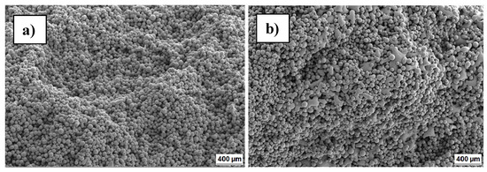 SEM images of samples magnified 30× with a scan speed of 14.6 m/s (a) and of 8.6 m/s (b).