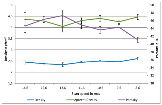 Furthermore, porosity investigation has shown that the porosity decreases with decreasing scan speed, as depicted in Figure 5. It seems to follow a nearly linear trend, while the compressive strength increases exponentially. The deviations on the porosity can be explained by the superimposing effects of the scan speed and the cooling rate during sintering, leading to local densifications of the sample. This effect is dependent on the size and geometry of the part, since a large part exhibits lower cooling rates than a small part, resulting in a higher possible heat jam. The density measurement also shows a linear increase with decreasing scan speed, while the apparent density of the material roughly stays at the same value of 4.3 g/cm3.