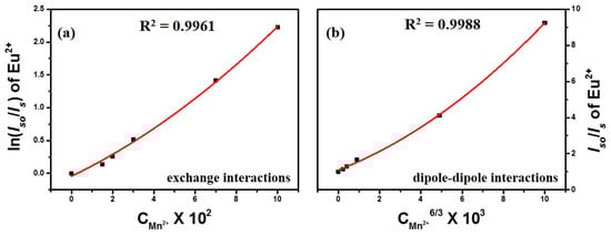 From the Equation (1), the critical distance Rc was calculated to be about 13.8 Å. This value is larger than 5 Å, indicating little possibility of energy transfer via the exchange interaction mechanism [17]. Thus, the electric multipolar interaction can take place for energy transfer between the Eu2+ and Mn2+ ions. According to Dexter’s energy transfer formula for exchange and multipolar interactions [18,19], the following relationship can be obtained: