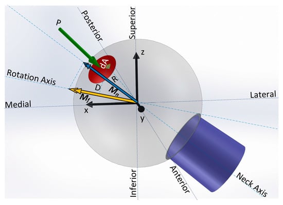Each activity cycle was sampled for steps (). Instantaneous was determined from the available kinematics [9], by means of Euler’s rotation theorem and the direction cosine rotation matrix. The direction of the contact force vector () is presented in the femur coordinate system in other studies [9]. Using and for each instant of an activity, the normal Hertz contact pressure () and its lever arm from the rotation axis () were obtained. The frictional moment was calculated such that the parameters were transformed to a spherical coordinate system with its axis aligned with the instantaneous force direction (Equation (1)). The calculated frictional moment was then projected onto the instantaneous axis of the neck to obtain the torque acting on the neck within the junction (Mn). A detailed description of the analytical approach for formulating frictional moment (Mf) has been described previously [23].