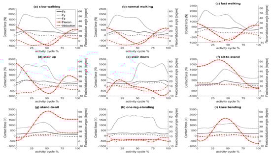 Contact forces in the x, y, and z axes along with flexion and abduction angles for one cycle of each activity for the average patient, data from Hip98 and Orthoload [16]: (a) slow walking; (b) normal walking; (c) fast walking; (d) stair up; (e) stair down; (f) sit-to-stand; (g) stand-to-sit; (h) one leg standing and (i) knee bending.