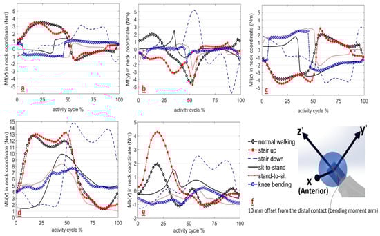 Components of frictional moments and bending moments for six daily activities in the neck coordinate system (x’y’z’): (a) Frictional moments about the x’ axis; (b) Frictional moments about the y’ axis; (c) Frictional moments about the z’ axis; (d) Bending moments about the x’ axis; (e) Bending moments about the y’ axis; and (f) Coordinate system definition.