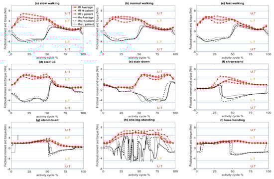 Frictional moment (Mf) and torque at the head-neck interface (Mn) for one cycle of each activity, for the average, heaviest (H), and lightest (L) patients. In the graphs, U.T and L.T indicate the upper and lower thresholds for depassivation, respectively. (a) Slow walking; (b) normal walking; (c) fast walking; (d) stair up; (e) stair down; (f) sit-to-stand; (g) stand-to-sit; (h) one leg standing and (i) knee bending.