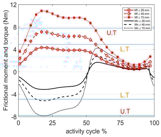 Frictional moment (Mf) and torque at the head–neck interface (Mn) for one cycle of normal walking, for the average patient, for different head diameters of 28, 46, and 70 mm. U.T = upper threshold for depassivation and L.T = lower threshold for depassivation.
