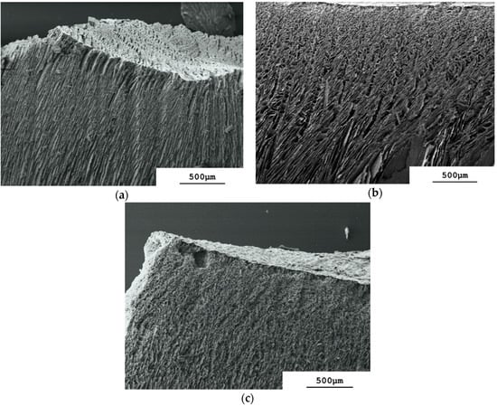The parallel arrangement of aligned lamellae and pores that is present through most of the depth of the monolith prepared from the φv = 0.128 slurry (Figure 3a) is formed by directional freezing from the frozen surface layer downwards. It is similar to that reported for freeze-cast ceramics prepared from the liquid nitrogen-driven cold-finger technique [13,21,25]. An aligned pore morphology comes from an approximately steady-state velocity of the freezing-front that produces continuous ice crystals of constant thickness running through a dispersion [16,21]. The aligned lamellae in Figure 3a appear dense and without holes. Reducing the slurry concentration to φv = 0.064 keeps the same aligned lamellae and pore structure in this central region of the monolith (Figure 3b) but the lamellae appear to be thinner and less dense and show cracks. This is more pronounced with φv = 0.032 (Figure 3c), where the lamellae show numerous perforations. Note that we did no SEM image analysis to measure the lamellae thickness because this was performed later with µCT (see Figure 7, to be discussed presently). Lowering the slurry concentration has already been shown to increase the porosity of regularly freeze-cast structures [15] and hence also their structural wavelength, λ, equal to the repeat distance of the aligned structure [24]. The use of vacuum-induced surface freezing produces therefore the same aligned structure of lamellae and pores seen with regular freeze casting using a liquid nitrogen-driven cold-finger. This extends through most of the depth of the monolith, even at slurry concentrations as low as φv = 0.032 = 12.5% w/w.