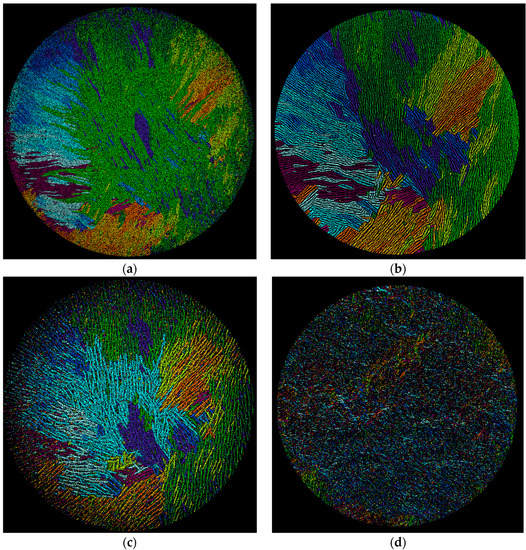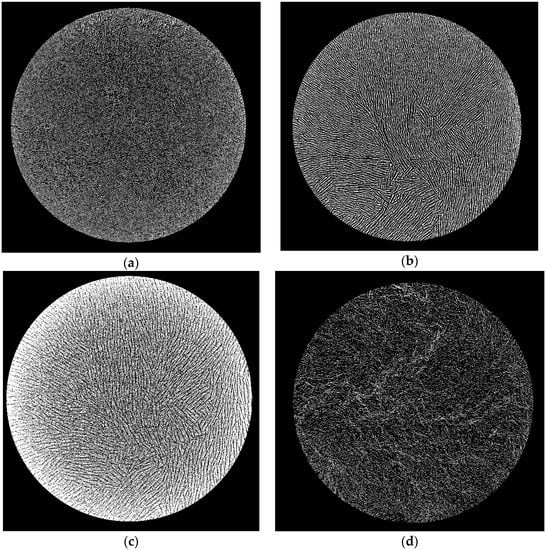 Image-analyzed X-ray micro-computed tomographs of images in Figure 5a–d to reveal orientation of domains at different heights, h, within monolith, h (cf. Figure 1a and Figure 5). (a) φv = 0.128, h = 0.90, pores image; (b) φv = 0.128, h = 0.5, lamellae image; (c) φv = 0.128, h = 0.18, pores image; (d) φv = 0.032, h = 0.9, lamellae image.