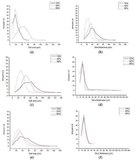 With φv = 0.064 and 0.032 the strut size is constant when moving down from h = 0.9 to 0.1 (Figure 7d,f, respectively). Again, the φv = 0.128 slurry departs from this behavior showing an increase with lower height (Figure 6b). This means that λ increases with depth at all slurry concentrations; at φv = 0.064 and 0.032 this comes from change in pore size and at φv = 0.128 is a result of larger strut thickness. Preiss et al. [24] found similar behavior with regularly freeze-cast ceramics, where with increasing distance from the cold finger a larger λ was accompanied by an unchanged strut thickness. These authors also reported that reducing the solid content of the ceramic dispersion made the struts thinner and reduced the λ. This same behavior is seen in Figure 7b,d,f across all three slurry concentrations. The changes in pore and lamellae size within a monolith and the dependence on slurry concentration observed with vacuum-induced surface freezing are therefore the same as those seen with regular freeze casting.