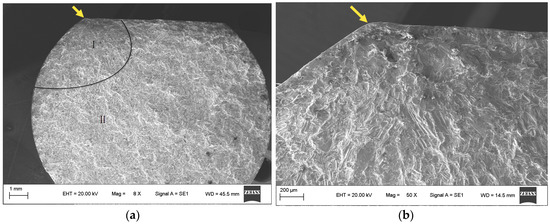 Figure 6a,b show that the plain fatigue crack initiated at the intersection of the plane and the cylinder of the specimens (shown by the arrow). The fatigue crack shows a fan-shaped radial propagation. Due to the low propagation rate of crack at the propagation zone, the fatigue crack was subjected to repeated extrusion and friction, where the fracture is more flat and smaller than the instant rupture region.