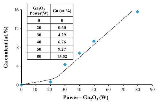 Ga content in ZnO thin films as a function of the sputtering power applied on the Ga2O3 target.
