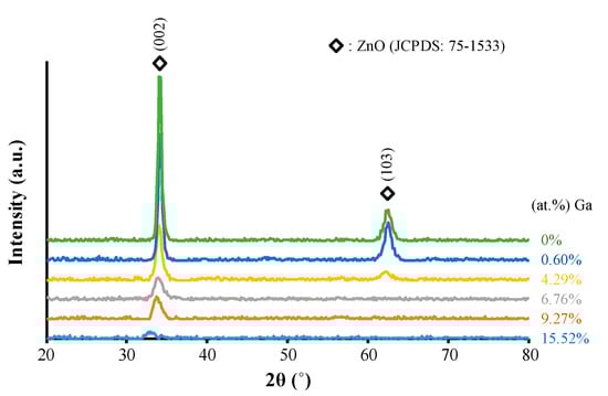 The X-ray diffraction patterns of the ZnO thin films with varying amounts of Ga are shown in Figure 2. When the doping content of Ga was about 0.6 at %, no obvious peak shift was observed. Even though the ionic radius of Ga3+ (0.062 nm) is smaller than that of Zn2+ (0.074 nm) [24], the amount of Zn2+ cations replaced by Ga3+ cations was at a very low level, so the contraction in lattice parameters was not considerable. However, when the content of Ga3+ cations exceeded 4.29 at %, the ZnO diffraction peaks moved to lower diffraction angles. This movement became more pronounced with the rise in Ga content owing to redundant Ga atoms entering into the ZnO lattice and forming Ga interstitial (Gai) defects, which enlarged the lattice parameters of ZnO. Moreover, as the extrinsic defects of (GaZn) (the substitution of Zn by Ga), and (Gai) were introduced into the ZnO films, the films’ crystallinity degraded as the Ga content increased.