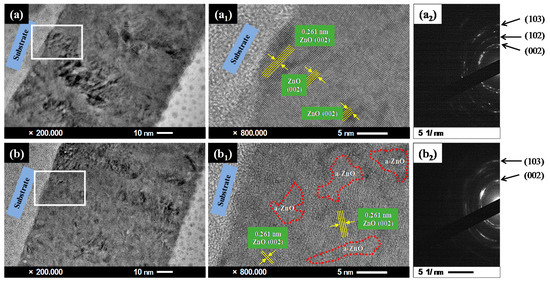 The degradation of the film’s crystallinity with increasing Ga content was revealed by TEM observation (Figure 3). The crystallinity of GZO films with more gallium (PGa2O3 = 50 W) was found to be inferior to those with less gallium (PGa2O3 = 30 W). Some amorphous domains (highlighted by red dotted lines) embedded in the crystallized ZnO are visible in Figure 3b1, but none can be found in Figure 3a1. Additionally, in comparing the selected area electron diffraction (SAED) patterns of these two films, the conversion of the diffraction spots (Figure 3a2) to the diffraction rings (Figure 3b2) indicated an obvious reduction in grain size, which degraded the film’s crystallinity.