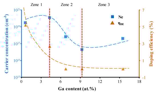 In order to understand the effective doping amount and the electrical activity of gallium in the ZnO films, the doping efficiency (ηDE) of Ga3+ cations in ZnO was also investigated (Figure 5). ηDE is defined as the ratio of the carrier concentration to the atomic ratio of Ga/(Ga + Zn), where the free electrons in ZnO films are mainly considered to be created by Ga substitution. As shown in Figure 5, the doping efficiency decreased with increasing gallium content, suggesting that more gallium atoms separated from the ZnO as gallium content increased.