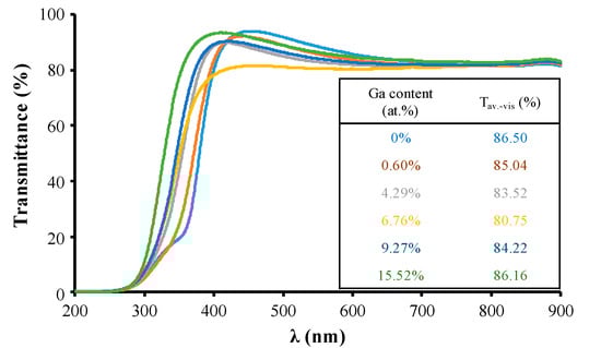 The variation in film transmittance as a function of Ga content in ZnO films.