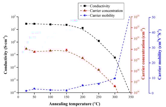 The film’s electrical thermal stability is shown in Figure 7. A ZnO film with 4.29 at % Ga was annealed at various temperatures under normal atmospheric conditions. When the annealing temperature was below 200 °C, the film’s conductivity was slightly degraded with increasing annealing temperature because the oxygen vacancies (VO) in the ZnO film were occupied by oxygen in oxygenated conditions. As reported by A.F. Kohan [27], oxygen vacancies, as the most important intrinsic donor defect, are favorable to the film’s n-type conductivity. Therefore, with the reduction in the number of oxygen vacancies, the carrier concentration also decreased. In addition, due to the reduction in the number of VO defects, the carrier scattering by these defects was restricted, so the carrier mobility improved.