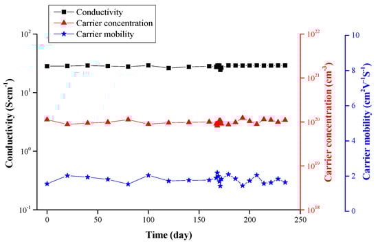 The film’s electrical time stability is given in Figure 8. The ZnO film with 4.29 at % Ga was placed in normal atmospheric conditions at ambient temperature for more than 240 days. With prolonged analysis time, the film’s electrical properties remained almost unchanged. In other words, the occupation of oxygen vacancies by oxygen atoms in oxygenated conditions could be activated only at high temperatures. Furthermore, gallium atoms cannot migrate in a ZnO lattice spontaneously at room temperature. Accordingly, the ZnO/Ga films presented satisfactory time stability.