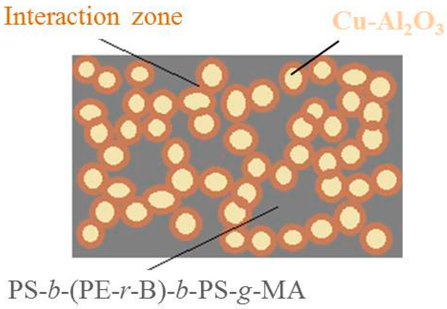3.5. Mechanical Properties of Cu–Al2O3/PS-b-(PE-r-B)-b-PS-g-MA Composites