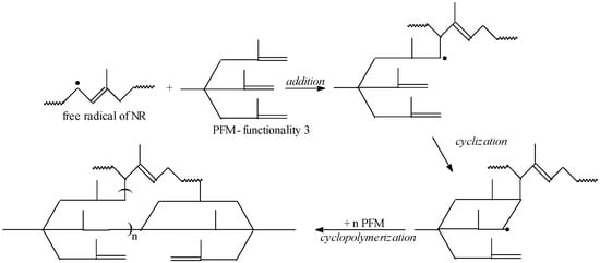 Once the macro-radical in the NR chain is formed, because of the TMPT presence, a new radical on TMPT is formed. Afterwards, a chain transfer reaction in the presence of NR takes place and leads to the formation of a new NR radical. The same sequence is conducted on the other functional groups of the TMPT, which leads to the formation of a product of cross-linking (Figure 4). On the other hand, after initiating of the reaction and formation of free radicals on NR chain, these PFMs are quickly cross-linked by free radical addition reactions and cyclo-polymerization (Figure 5), forming small vitrified thermo-reactive particles [33,34,35]. These particles act as multi-modal cross-linking centers, binding a large number of NR chains [36]. We can conclude that the Type I co-agents (TMPT, EDMA or ZDA) are very reactive monomers, favoring addition reactions leading to homo-polymerization and subsequent grafting to polymer chains, through either direct addition reactions or through abstraction/coupling reactions with polymer chains [29]. Regardless of mechanism, the Type I co-agents have increased the cross-link density, as shown in Figure 2.