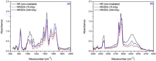 FTIR spectra in the range of (a) 2000 cm−1–600 cm−1 and (b) 4000 cm−1–2000 cm−1 for NR/ZDA irradiated at 75 and 300 kGy.