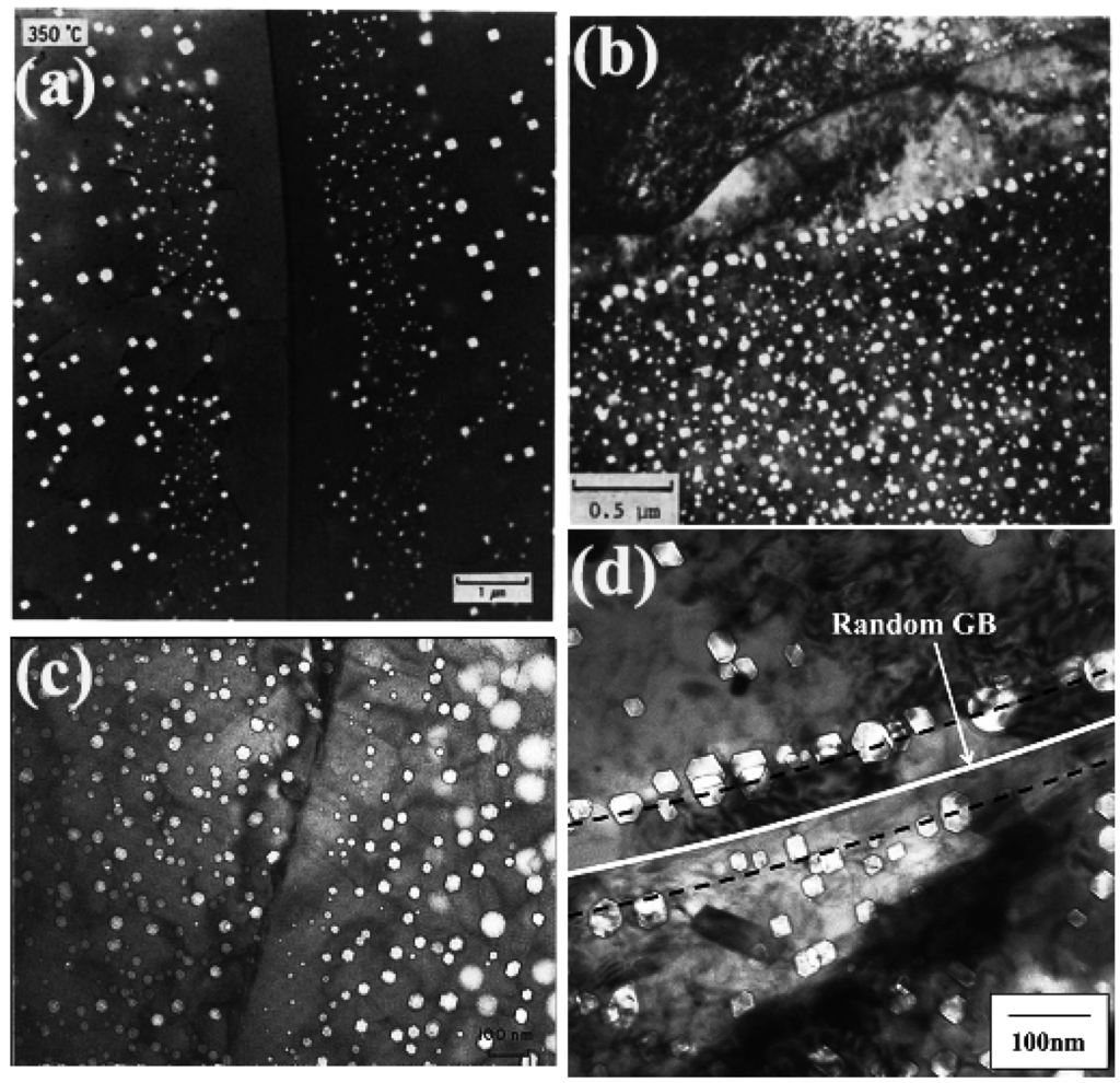(2) The VDZs along GBs usually exhibit an enhancement of void formation at the edges of the zone, and unusually large voids are formed in one or two rows in the edge. This phenomenon seems to be closely related to the first feature. But the formation of the unusually large voids at the edge of the VDZs may be detrimental particularly not only in swelling, but also in the mechanical property when the voids there begin to interconnect. It is generally accepted that the formation of this void “wall” or voids of larger sizes at the edges of the VDZs is due to the difference between the mobility of vacancies and interstitials. The interstitials could be attracted and adsorbed by the GBs from a wider band on both sides of the GBs than the band for vacancies, and the overlap of these two bands leads to the appearance of the VDZs. However, the existence of the region, where excess vacancies are created on each side of the GBs, leads to the rapid growth of voids. This theory can be used to explain the formation of the unusually large voids at the edge of the VDZs, but it could not explain the observed dependence of the large void sizes upon the width the one-sided denuded zone [11]. Another alternative explanation of the unusually large voids formed in the edge of the VDZs is the interaction of dislocations with the GBs, and the existence of a band with a different density of dislocations relative to the bulk during irradiation [9]. If this band is wider than the VDZs, one could expect different void formation characteristics. Moreover, the dislocations also more readily absorb interstitials than vacancies [23,24].