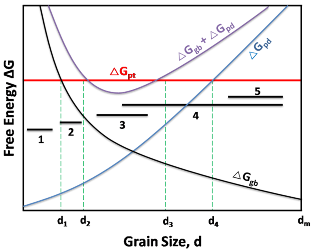 Schematic descriptions for the free energy of point defects (ΔGpd), grain boundaries (ΔGgb) and phase-transition (ΔGpt) in irradiated nanostructured materials as a function of grain size (d) [38].