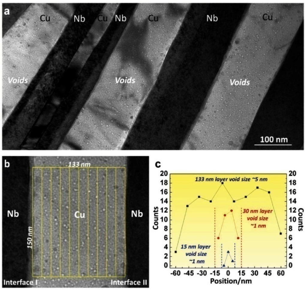 (a) Irradiation-induced voids in Cu layers in irradiated accumulative roll bonding (ARB) nanolayered (NL) Cu-Nb composites with individual layer thickness of 135 nm; (b) illustration of the method to determine the void number density in Cu layers; and (c) plot of the number density of voids as a function of distance from the center of the layer in 133 nm-, 30 nm-, and 15 nm-thick Cu layers [47].
