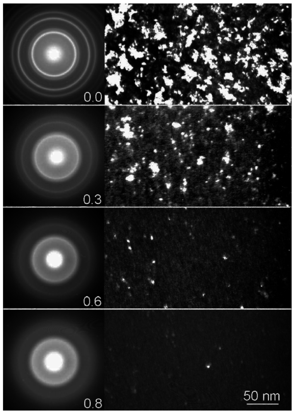 Sequence of dark-field TEM images and associated electron-diffraction patterns showing the effects of Xe-ion irradiation on nanocrystalline ZrO2. The number in the bottom right corner of each diffraction pattern is the ion dose in dpa. The dark-field images were taken with the objective aperture centered over the bright (111) diffraction ring [67].