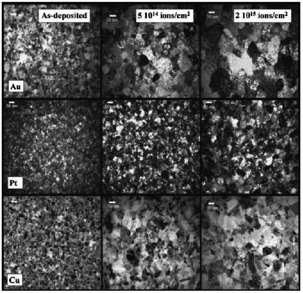 Sequence of bright-field TEM images taken at different ion doses showing grain-growth induced by ion irradiation at room temperature; from top to bottom: pure Au thin-film irradiated with 500 keV Ar ions, Ptthin-film irradiated with 500 keV Ar ions, and Cu thin-film irradiated with 500 keV Kr ions [81]. The scale mark is 50 nm.