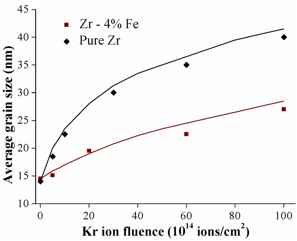Average grain size versus ion fluence for pure Zr and Zr-1.2%Fe irradiated with 500 keV Kr ions at 20 K [80].