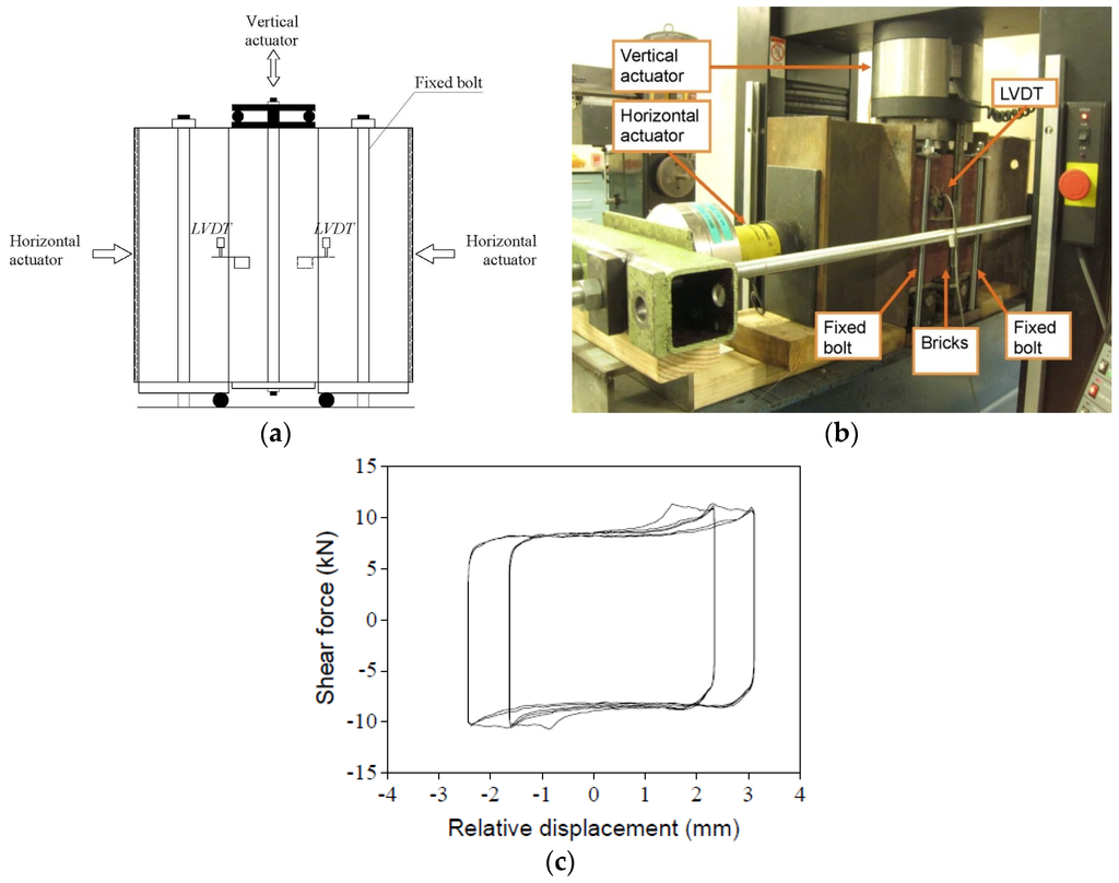 Material tests on brick and mortar include standards tests such as the compressive strength tests on a single brick [], the lateral modulus of rupture test [], the bond wrench test [] the and compressive strength test on both dry stacked and traditional masonry prisms [], as well as the friction test on dry stacked masonry triplets. The mechanical properties of the bricks and mortar are summarized in Table 1. The cyclic triplet test was a variation of the European standard triplet shear test []. The test setup is shown in Figure 3a,b. In this test, two independent actuators have been used: one for the vertical cyclic displacement; the other for the horizontal constant pressure. The real-time vertical shear load was recorded from the embedded pressure sensor in the vertical actuator; the relative displacement was recorded from the linear variable displacement transducers (LVDTs).